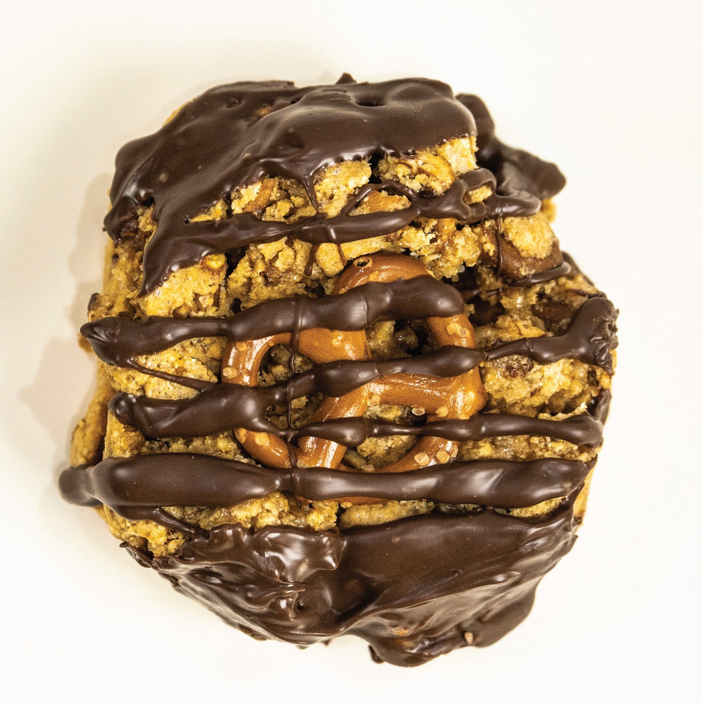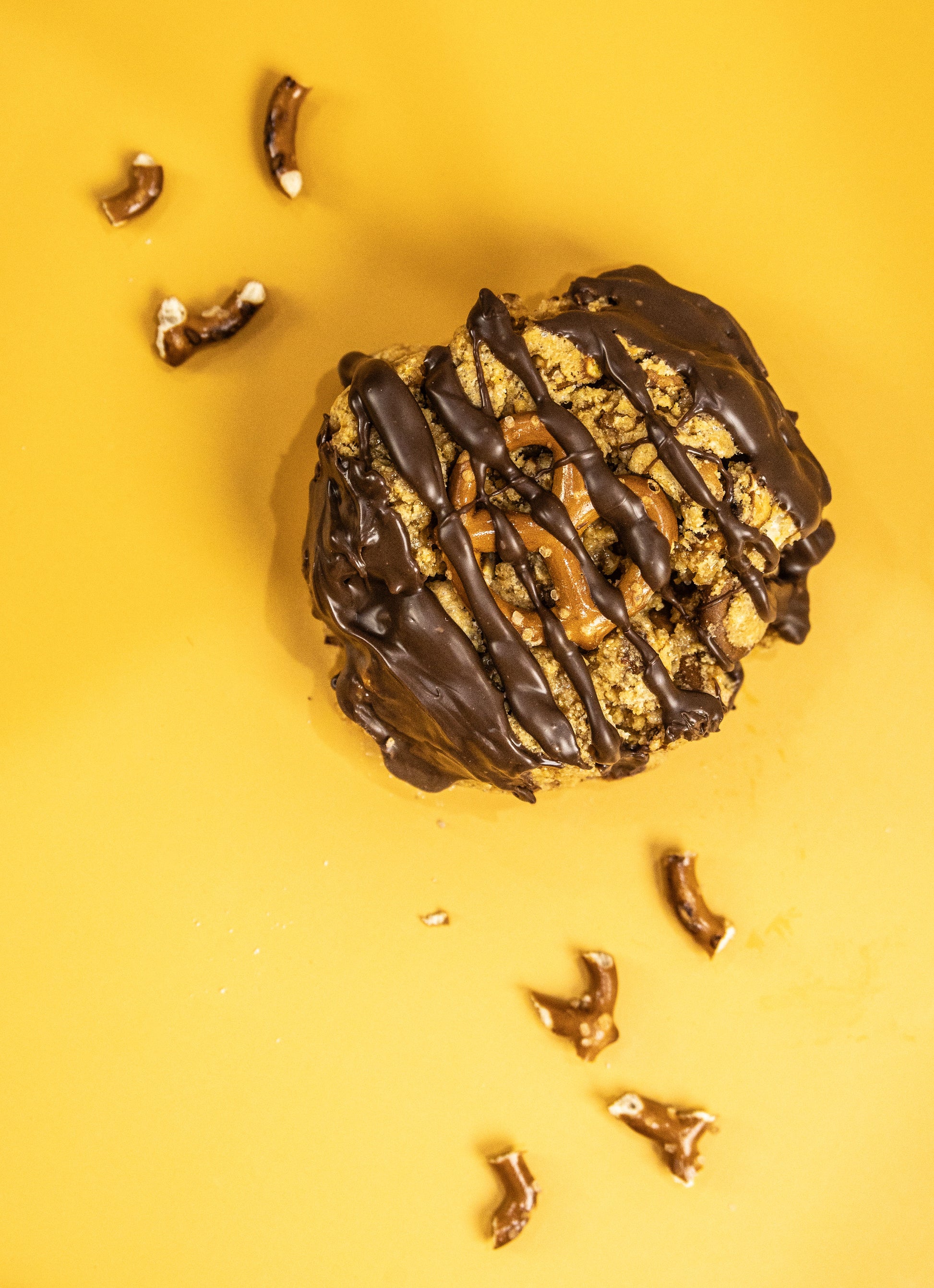 A yummy blend of Toffee and pretzel topped with a chocolate drizzle and a crisp pretzel. Salty and Sweet in one pretty package!